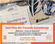 Unter dem Motto „Wein und Wissen“ laden die Internationale Gutenberg-Gesellschaft und die Gutenberg Stiftung herzlich ein zur abendlichen Vortragsreihe „Jour Fixe der Freunde Gutenbergs“ mit anschließender Weinprobe in der Kulturei Mainz. Thema: #Süttember – Herbst der Handschrift |
