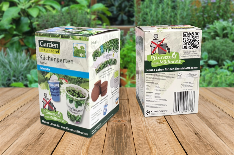Garden Feeling Küchengarten gibt Kräuter-Liebhabern ein Saatset an die Hand, mit dem sie Küchenkräuter ganz einfach selbst anbauen können. Und zwar in alten Einweg-Kunststoffbechern, die sich im Handumdrehen in attraktive Kräutertöpfe verwandeln lassen. So nachhaltig wie der Gedanke selbst ist auch die Verpackung der STI Group für das Saatset – materialsparend, FSC-zertifziert und klimaneutral.