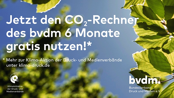 Mit der Klima-Aktion der Druck- und Medienverbände können alle Druckunternehmen, die noch nicht Mitglied in der Klimainitiative sind, den CO2-Rechner 6 Monate lang kostenfrei nutzen. In diesem Zeitraum erhalten Betriebe den vollen Leistungsumfang, können die CO2-Emissionen von Druckprodukten bestimmen und auf Kundenwunsch auch ausgleichen. Dafür bietet der CO2-Rechner der Druck- und Medienverbände ein breites Angebot an Klimaschutzprojekten. Die Ermittlung der CO2-Emissionen erfolgt nach den Vorgaben des ISO-Standards und alle Projekte für den CO2-Ausgleich sind nach dem höchsten Standard – dem Gold Standard – zertifiziert.