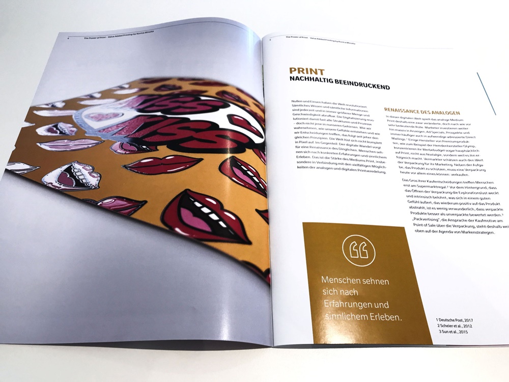 „Druckerzeugnisse informieren den Konsumenten und erwecken seine Aufmerksamkeit. Unbewusst navigieren und begeistern sie ihn, setzen Emotionen frei und unterstützen schlussendlich den Kaufentscheid“, sagt Mirko Pelzer, Product Marketing Manager Professional Printing bei Konica Minolta. „Allein digitale Druck-, Veredelungs- und Weiterverarbeitungsverfahren sind in der Lage, eine wirtschaftliche Produktion von individualisierten Druckerzeugnissen für die direkte Kundenkommunikation zu ermöglichen. Werden diese Technologien intelligent inszeniert, sorgen sie für maximalen Mehrwert im Multichannel-Publishing. Bei Agenturen und Werbern ist der Bedarf an solchen atemberaubenden Druckerzeugnissen mit multisensorischen Effekten hoch im Kurs.“
