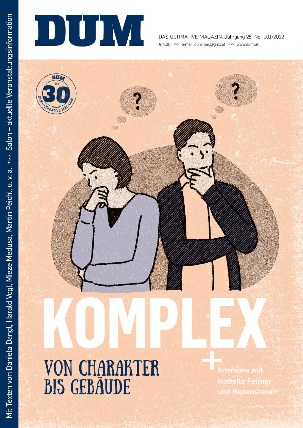 Ausgabe 101 der Literaturzeitschrift „DUM - Das ultimative Magazin“ ist erschienen. Das Rahmentheme für die beteiligten Autoren lautete „Komplex - von Charakter bis Gebäude“. Leseproben sowie alle Bestellmöglichkeiten finden interessierte Leser hier.