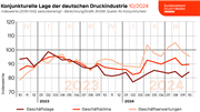 Nach dem deutlichen Rücksetzer im September stieg die Stimmung der Unternehmen in der deutschen Druck- und Medienwirtschaft im Oktober 2024 wieder leicht an. Der vom Bundesverband Druck und Medien ermittelte Geschäftsklimaindex verzeichnete saison- und kalenderbereinigt ein leichtes Plus von 0,5 Prozent im Vormonatsvergleich. Mit 89,8 Punkten notierte der Index im Oktober damit rund 2,2 Prozent über dem entsprechenden Vorjahresniveau. Während die Unternehmen ihre aktuelle Lage im Oktober besser einschätzten, trübten sich die Geschäftserwartungen hinsichtlich der Geschäftsentwicklung der nächsten 6 Monate weiter ein. › mehr |